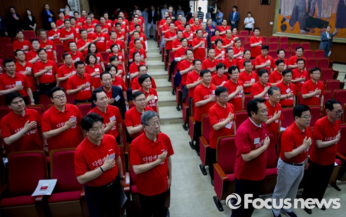 새누리당 의원 일동10일 오전 경기도 과천 국가공무원인재개발원에서 열린 2016 새누리당 정책워크숍에 참석한 김희옥 혁신비대위원장, 정진석 원내대표 등 의원들이 국기에 대한 경례를 하고 있다. 2016.06.10 박동욱 기자