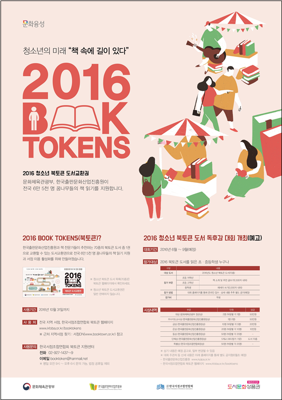북토큰은 문화체육관광부, 각 시도교육청이 전국 초·중·고생을 대상으로 배포하고 있다. 북토큰은 전국 지역서점을 찾거나 한국서점조합연합회 북토큰 주문센터에 접속해 사용할 수 있다. 사용기간은 올 10월말까지다.문화체육관광부는 서울 강남구 코엑스(COEX)에서 개최되는 '2016 서울국제도서전'에서 오는 15일부터 19일까지 어린이와 청소년을 위한 북토큰 사업을 진행한다. <사진제공=문화체육관광부>