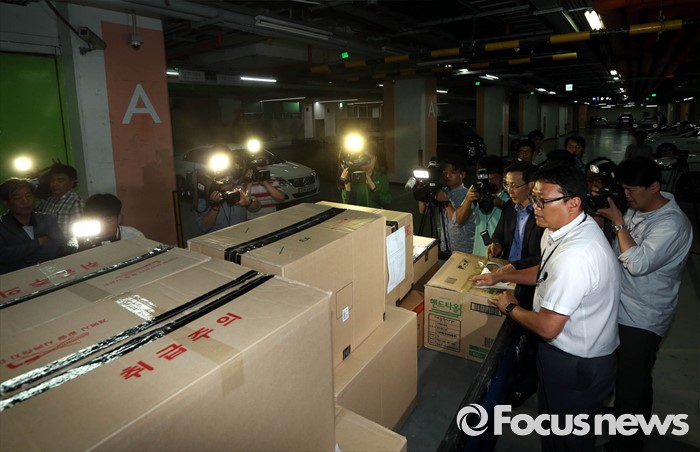 (서울=포커스뉴스) 10일 오후 서울 중구 소공동 롯데호텔에서 검찰 수사관들이 롯데그룹 정책본부 등 계열사와 신동빈 롯데그룹 회장 집무실에서 압수수색한 서류를 화물차에 싣고 있다.
