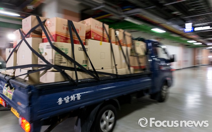 (서울=포커스뉴스) 10일 오후 서울 중구 소공동 롯데호텔에서 검찰 수사관들이 롯데그룹 정책본부 등 계열와 신동빈 롯데그룹 회장 집무실에서 압수수색한 서류를 화물차에 싣고 호텔을 나서고 있다.