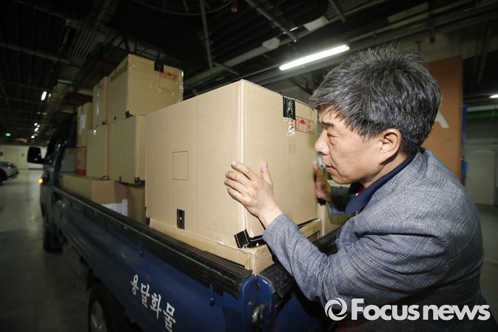 (서울=포커스뉴스) 10일 오후 서울 중구 소공동 롯데호텔에서 검찰 수사관들이 롯데그룹 정책본부 등 계열와 신동빈 롯데그룹 회장 집무실에서 압수수색한 서류를 화물차에 싣고 있다.