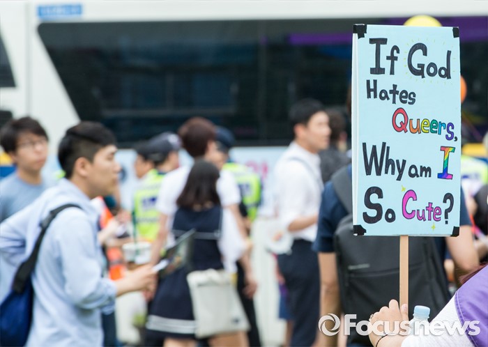 (서울=포커스뉴스) 11일 오후 서울광장에서 열린 제17회 퀴어문화축제에서 한 참가자가 퀴어문화를 지지하는 손팻말을 들고 있다.