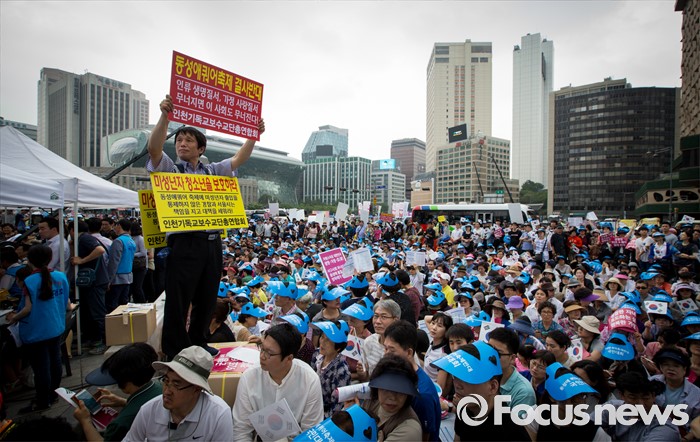 (서울=포커스뉴스) 11일 오후 서울 중구 대한문 앞에서 열린 '2016 서울광장 동성애축제 반대 국민대회'에서 참석자들이 동성애를 반대하는 손팻말을 들고 있다.