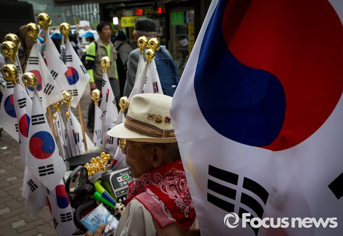 (서울=포커스뉴스) 11일 오후 서울 중구 대한문 앞에서 열린 '2016 서울광장 동성애축제 반대 국민대회'에서 한 참석자가 태극들 사이에서 발언을 듣고 있다.