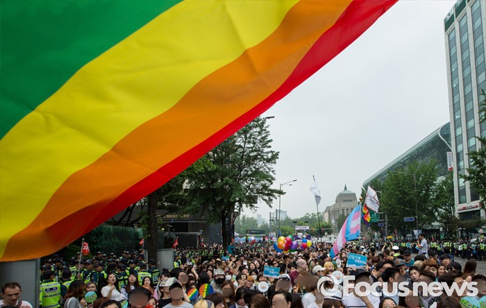 (서울=포커스뉴스) 11일 오후 제17회 퀴어문화축제 참가자들이 서울광장을 출발해 을지로일대를 지나며 퀴어퍼레이드를 벌이고 있다.
