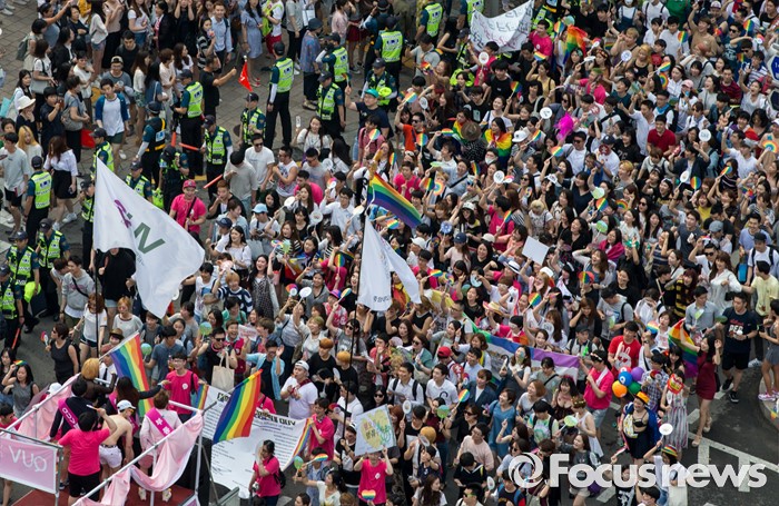 (서울=포커스뉴스) 11일 오후 제17회 퀴어문화축제 참가자들이 서울광장을 출발해 을지로 일대를 지나며 퀴어퍼레이드를 벌이고 있다.