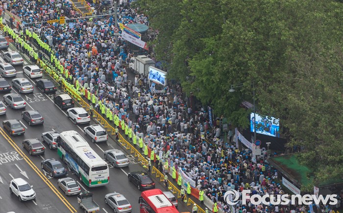 (서울=포커스뉴스) 11일 오후 서울 중구 대한문 앞에서 열린 '2016 서울광장 동성애축제 반대 국민대회'에서 참석자들이 동성애를 반대하는 구호를 외치고 있다.
