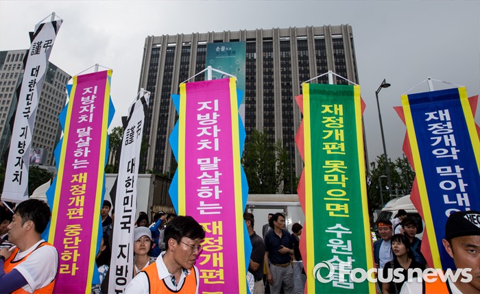 (서울=포커스뉴스) 11일 오후 서울 광화문광장에서 열린 지방재정 개악 저지 지방자치 수호 시민문화제에서 참석자들이 지방재정 개편을 규탄하는 손팻말을 들고 있다.