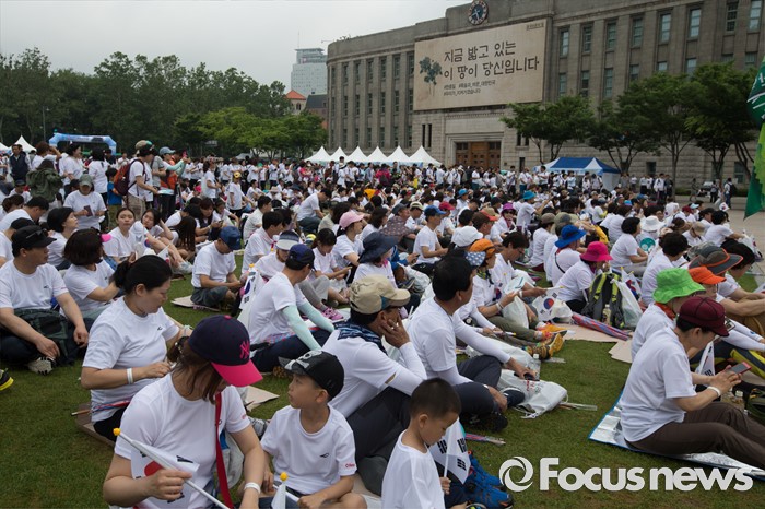 (서울=포커스뉴스) 12일 오전 서울 중구 서울시청 광장에서 열린 제 7회 나라사랑 고궁걷기 대회에 시민들이 참가하고 있다.