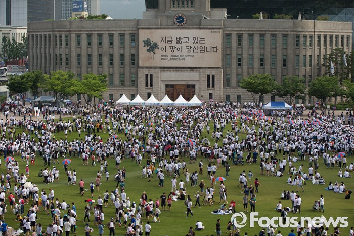 (서울=포커스뉴스) 12일 오전 서울 중구 서울시청 광장에서 열린 제 7회 나라사랑 고궁걷기 대회에 시민들이 참가하고 있다.