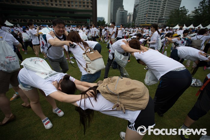 (서울=포커스뉴스) 12일 오전 서울 중구 서울시청 광장에서 열린 '제7회 나라사랑 고궁걷기 대회'에 참가한 시민들이 준비운동을 하고 있다.