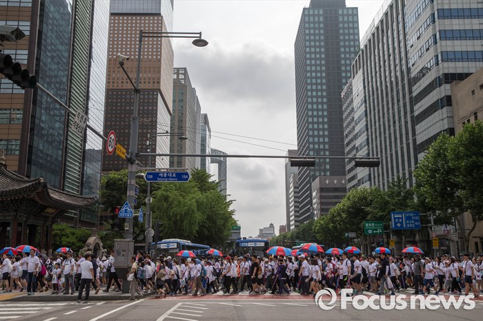 (서울=포커스뉴스) 12일 오전 서울 중구 서울시청 광장에서 열린 '제7회 나라사랑 고궁걷기 대회'에 참가한 시민들이 경복궁을 향해 걷고 있다.