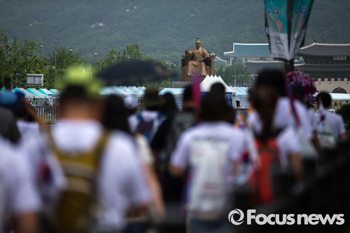 (서울=포커스뉴스) 12일 오전 서울 중구 서울시청 광장에서 열린 '제7회 나라사랑 고궁걷기 대회'에 참가한 시민들이 경복궁을 향해 걷고 있다.