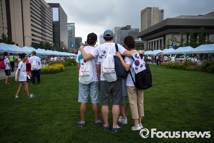 (서울=포커스뉴스) 12일 오전 서울 중구 서울시청 광장에서 열린 '제7회 나라사랑 고궁걷기 대회'에 참가한 시민들이 기념촬영을 하고 있다.