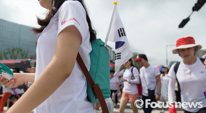 (서울=포커스뉴스) 12일 오전 서울 중구 서울시청 광장에서 열린 제 7회 나라사랑 고궁걷기 대회에 참가한 시민들이 경복궁을 향해 걷고 있다.