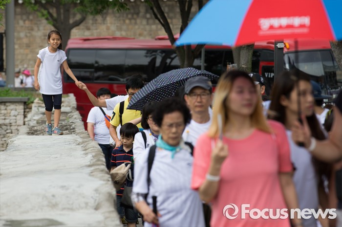 (서울=포커스뉴스) 12일 오전 서울 중구 서울시청 광장에서 열린 제 7회 나라사랑 고궁걷기 대회에 참가한 시민들이 경복궁을 지나 창경궁을 향해 걷고 있다.