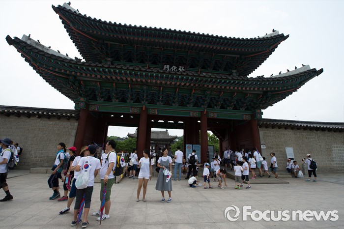 (서울=포커스뉴스) 12일 오전 서울 종로구 창경궁에서 '제7회 나라사랑 고궁걷기 대회'에 참가한 시민들이 고궁을 둘러보며 걷고 있다.
