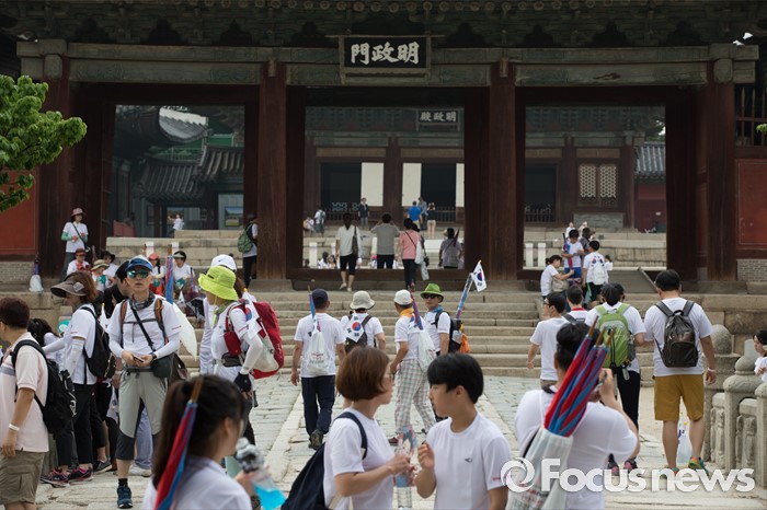 (서울=포커스뉴스) 12일 오전 서울 종로구 창경궁에서 '제7회 나라사랑 고궁걷기 대회'에 참가한 시민들이 고궁을 둘러보며 걷고 있다.