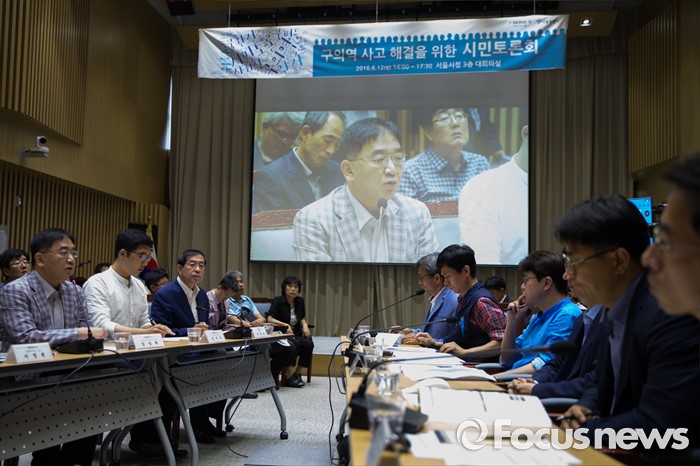 (서울=포커스뉴스) 12일 오후 서울 중구 서울시청에서 박원순 서울시장과 전문가 패널, 시민들이 '구의역 사고 해결을 위한 시민토론회'에 참석해 발표 및 토론을 하고 있다.