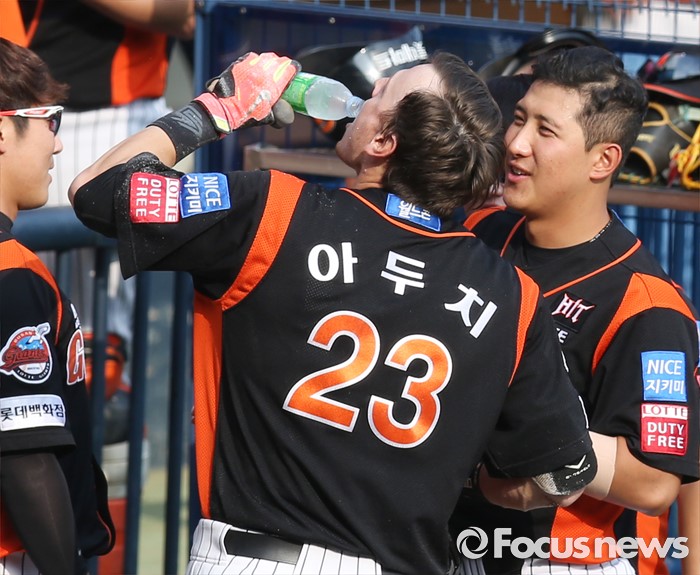 (서울=포커스뉴스) 12일 서울 잠실구장에서 열린 2016 프로야구 롯데-두산 경기 3회초 롯데 선두타자 아두치가 중견수를 넘기는 3루타와 송구 실책을 틈타 홈까지 단숨에 달려 득점한후 황재균이 넘겨준 은료수를 마시고 있다.