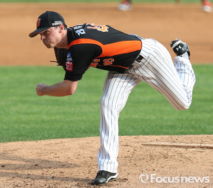 (서울=포커스뉴스) 12일 서울 잠실구장에서 열린 2016프로야구 롯데-두산 경기에서 1회말 롯데 선발투수 레일리가 투구하고 있다.