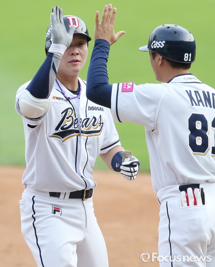 (서울=포커스뉴스) 12일 서울 잠실구장에서 열린 2016 프로야구 롯데-두산 경기 4회말 무사 만루에서 두산 박세혁이 1타점 좌전 안타를 치고 1루에서 강동우 코치와 하이파이브하고 있다.