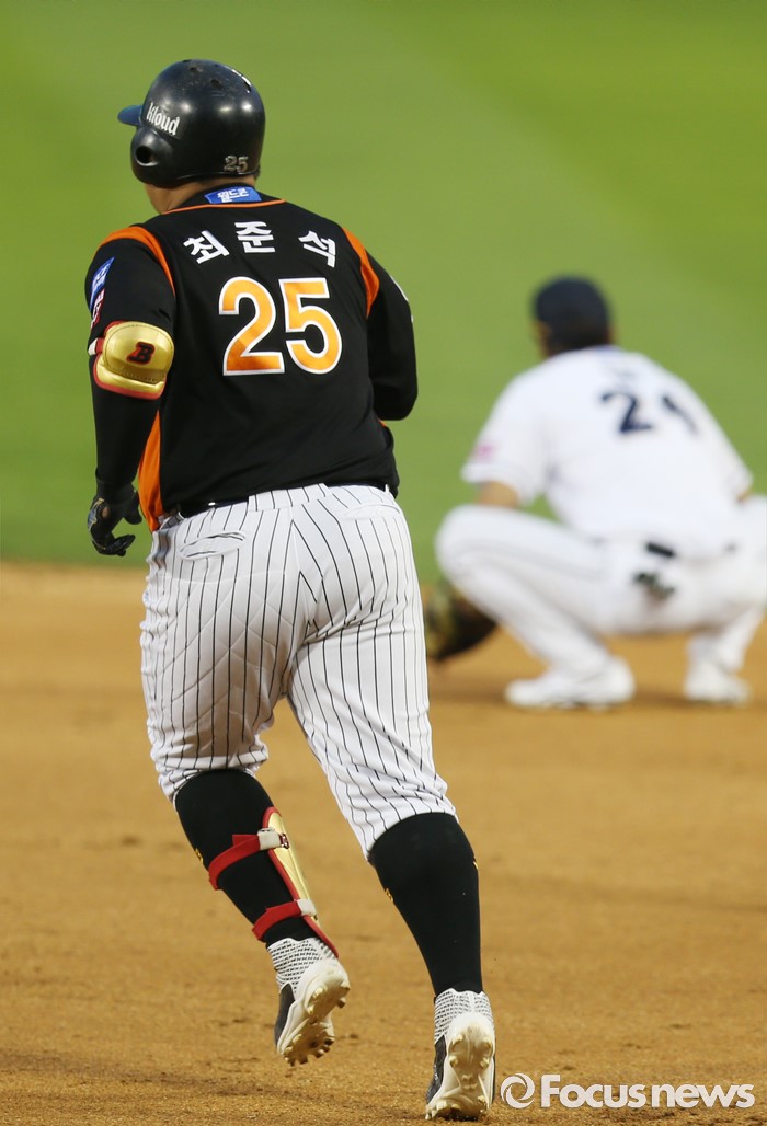 (서울=포커스뉴스) 12일 서울 잠실구장에서 열린 2016 프로야구 롯데-두산 경기 9회초 2사 1루에서 롯데 최준석이 극적인 동전 2점 우월 홈런을 치고 뛰어 나가고 있다. 두산 2루수 오재원이 아쉬워하며 주저 앉아 있다.