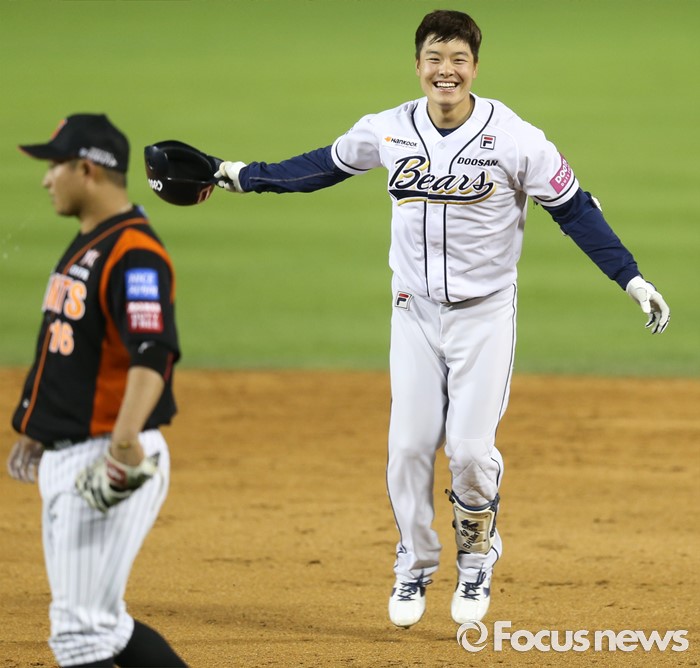 (서울=포커스뉴스) 12일 서울 잠실구장에서 열린 2016 프로야구 롯데-두산 경기에서 연장 11회말 끝내기 2루타를 친 두산 민병헌이 환호하고 있다.