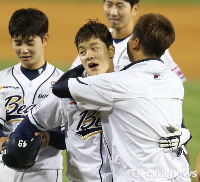 (서울=포커스뉴스) 12일 서울 잠실구장에서 열린 2016 프로야구 롯데-두산 경기에서 연장 11회말 끝내기 2루타를 친 민병헌을 투수 정재훈이 끌어 안고 있다.
