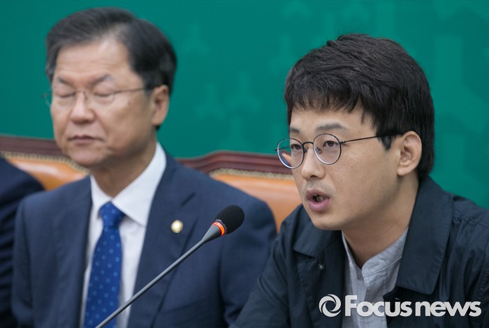 (서울=포커스뉴스) 13일 오전 서울 여의도 국회에서 열린 국민의당 최고위원회의에 국민대표로 참석한 최정진(오른쪽) 시인이 발언하고 있다.