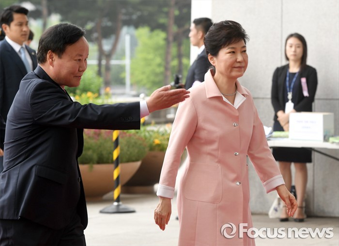 (서울=포커스뉴스) 박근혜(오른쪽) 대통령이 13일 오전 서울 여의도 국회에서 열린 20대 국회 개원식 연설을 위해 김재원 정무수석의 안내를 받으며 입장하고 있다.