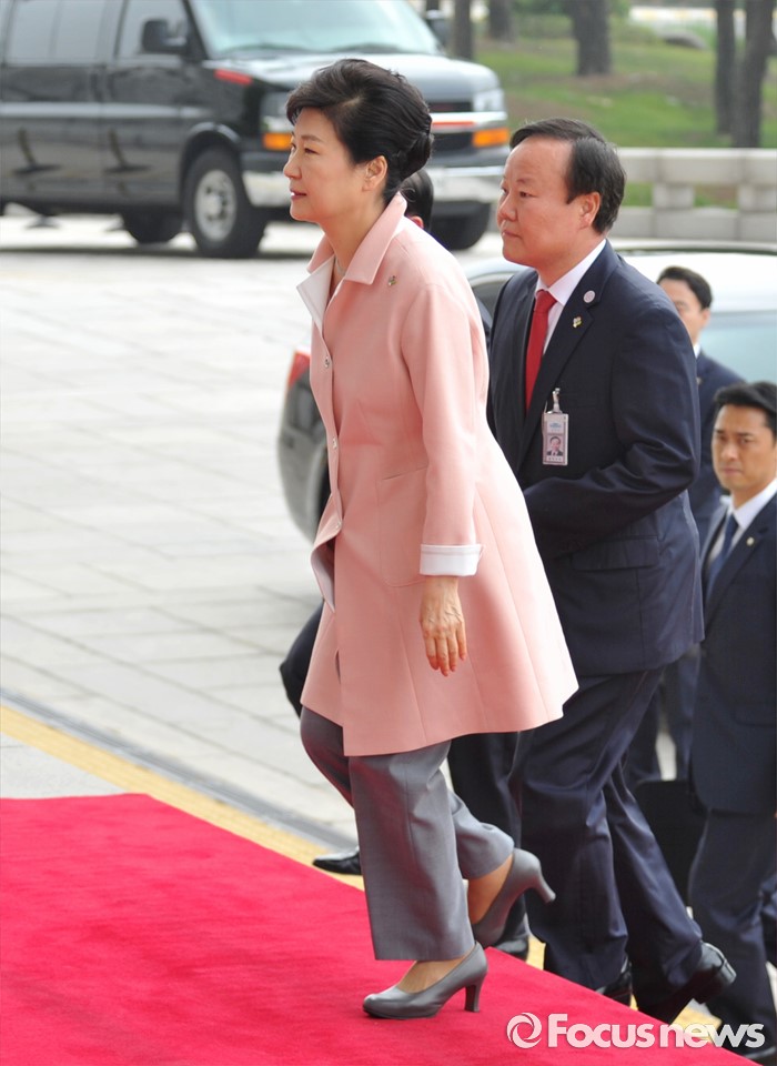 (서울=포커스뉴스) 박근혜 대통령이 13일 오전 서울 여의도 국회에서 열린 20대 국회 개원식 연설을 위해 본청으로 들어서고 있다.