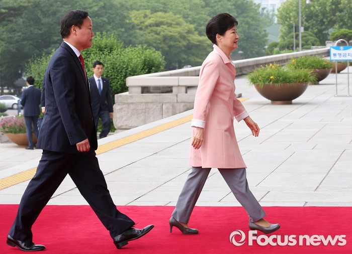 (서울=포커스뉴스) 박근혜 대통령이 13일 오전 서울 여의도 국회에서 열린 20대 국회 개원식 연설을 위해 본청으로 들어서고 있다. 왼쪽은 김재원 정무수석.