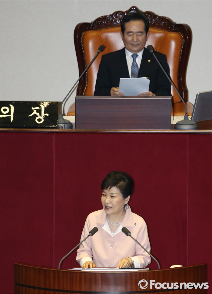 (서울=포커스뉴스) 박근혜 대통령이 13일 오전 서울 여의도 국회에서 열린 20대 국회 개원식에 참석해 연설을 하고 있다.