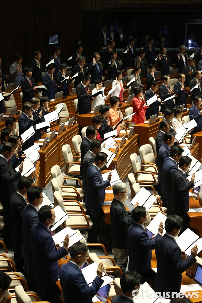 (서울=포커스뉴스) 13일 오전 서울 여의도 국회에서 열린 20대 국회 개원식에 참석한 의원들이 선서를 하고 있다.
