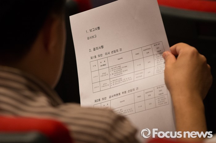 (서울=포커스뉴스) 13일 오전 서울 중구 대우조선해양 본사 대회의실에서 열린 '제17기 제2차 임시주주총회'에 주주들이 안내문을 보고 있다.