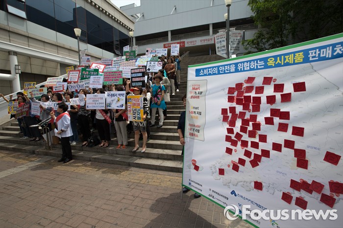 (서울=포커스뉴스) 13일 오전 서울 용산구 롯데마트 서울역점 앞에서 소비자단체 회원들이 롯데마트의 자사 가습기 살균제품 피해에 대한 책임있는 행동을 촉구하고 옥시 제품 판매 중단을 요구하는 집회를 하고 있다.