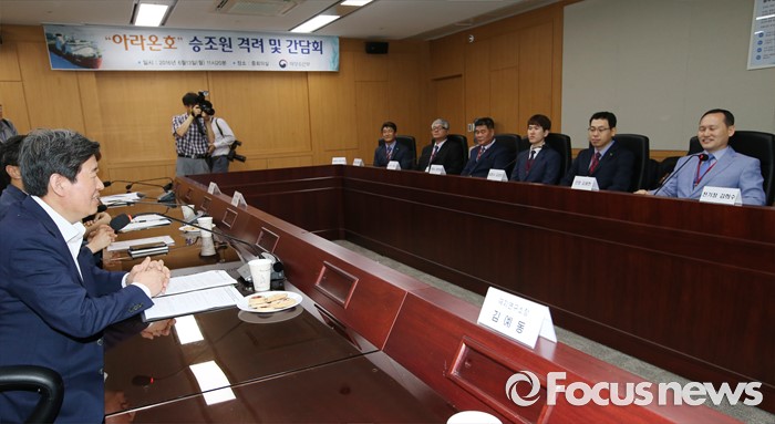 (세종=포커스뉴스) 윤학배(왼쪽) 해양수산부 차관이 13일 오전 세종시 정부세종청사 해수부 중회의실에서 열린 아라온호 승조원 격려 및 간담회에서 인사말을 하고 있다.