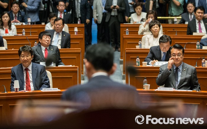 (서울=포커스뉴스) 정진석(앞줄 오른쪽)새누리당 원내대표와 법사위원장을 맡게 된 권성동(앞줄 왼쪽) 의원이 13일 오전 서울 여의도 국회에서 열린 의원총회에 참석해 김도읍 원내수석부대표의 발언을 경청하고 있다.