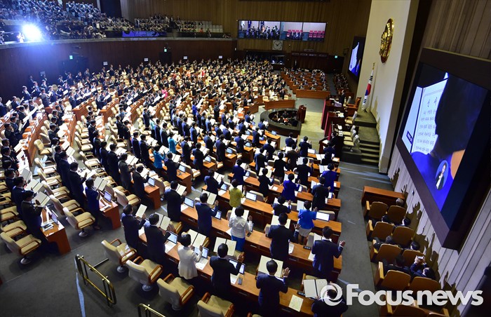(서울=포커스뉴스) 13일 오전 서울 여의도 국회에서 열린 20대 국회 개원식에 참석한 의원들이 선서를 하고 있다.