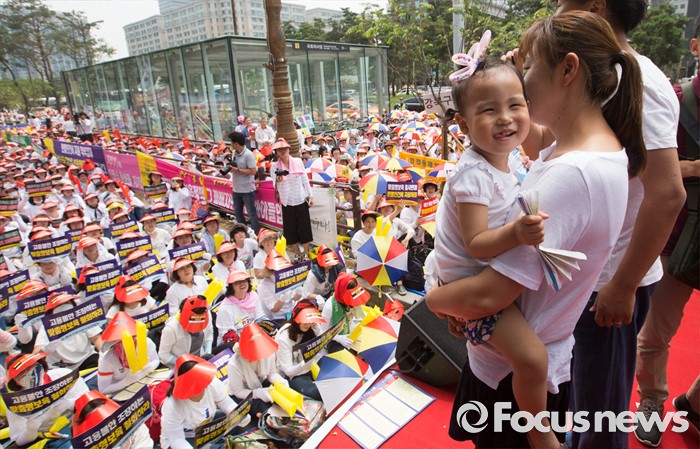(서울=포커스뉴스) 13일 오후 서울 여의도 KB국민은행 앞에서 열린 맞춤형 보육 저지와 누리과정 예산 해결 및 평등지원 촉구 결의대회에서 김용진(42)씨가 한국가정어린이집연합회 지지발언 중 딸 김윤솔(4)이 환하게 웃고 있다.