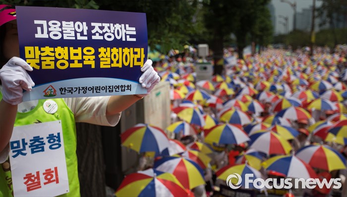 (서울=포커스뉴스) 13일 오후 서울 여의도 KB국민은행 앞에서 한국가정어린이집연합회 회원들이 맞춤형 보육 저지와 누리과정 예산 해결 및 평등지원을 촉구하는 결의대회를 하고 있다.
