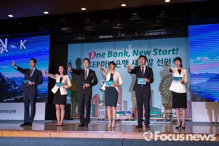 (서울=포커스뉴스) 13일 오후 서울 중구 KEB 하나은행 본점에서 열린 'One Bank, New Start' 선언식에서 직원들이 새로운 출발의 결의를 다지며 구호를 외치고 있다.