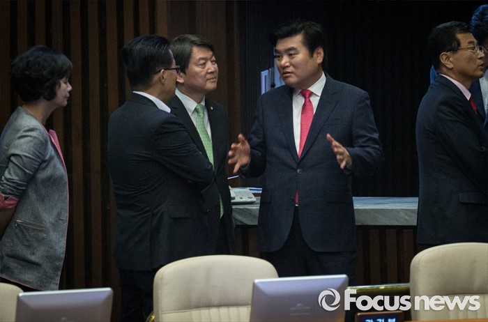 (서울=포커스뉴스) 13일 오후 서울 여의도 국회에서 상임위원장 선출을 위해 열린 343회 국회(임시회) 2차 본회의에 참석한 원유철(오른쪽 두번째) 새누리당 전 원내대표가 안철수(가운데) 국민의당 대표와 대화하고 있다.