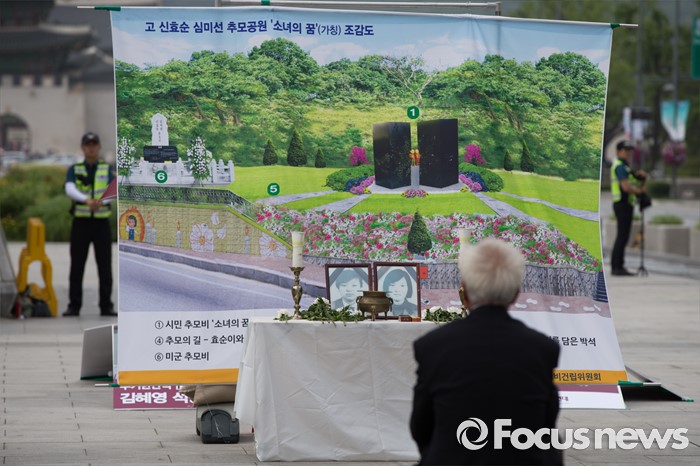(서울=포커스뉴스) 2002년 미군 궤도차량에 치여 숨진 고(故) 신효순·심미선 양 14주기인 13일 오후 서울 종로구 광화문 광장에 마련된 분향소에서 참가자가 앉아 있다.
