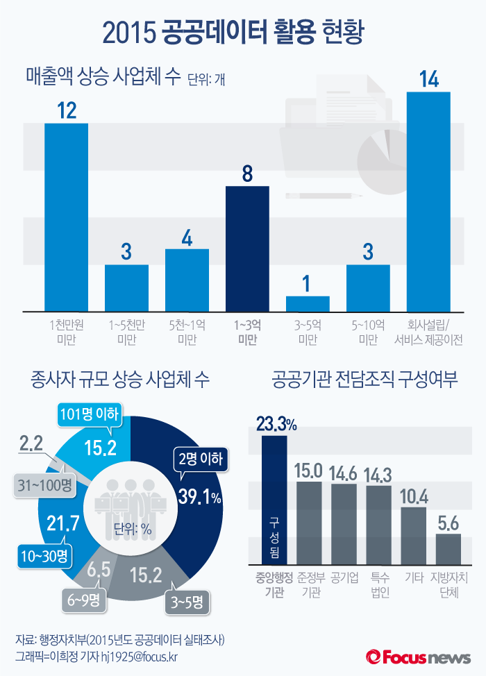 (서울=포커스뉴스) 행정자치부 '2015년도 공공데이터 이용실태 조사' 보고서에 따르면 지난해 공공데이터 활용 기업의 매출과 고용이 늘어났지만 관련 데이터 전담조직은 충분하지 못하다는 결과가 나왔다. 특히 지방자치단체는 조사대상 178곳 중 5.6%만 전담조직이 꾸려져 중앙행정기관 조직률 23.3%에 훨씬 못 미치는 결과가 나타났다.