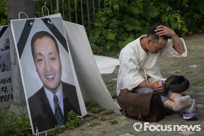 (서울=포커스뉴스) 13일 오후 유성기업 노동자 故 한광호씨의 분향소를 양재동 현대차 본사 앞으로 옮기는 꽃길 100리 행진에 참여한 노동자들이 시청 분향소를 떠나 국회를 향하던 중 잠시 휴식을 취하고 있다.