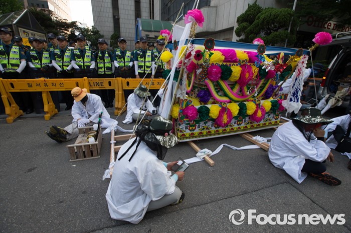 (서울=포커스뉴스) 13일 오후 유성기업 노동자 故 한광호씨의 분향소를 양재동 현대차 본사 앞으로 옮기는 꽃길 100리 행진에 참여한 노동자들이 시청 분향소에서 출발해 국회로 행진하던 중 더불어 민주당 당사 앞에서 잠시 휴식을 취하고 있다.