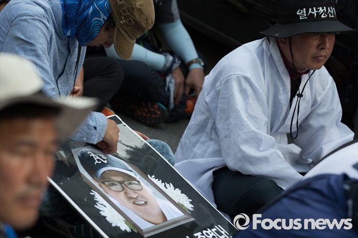 (서울=포커스뉴스) 13일 오후 유성기업 노동자 故 한광호씨의 분향소를 양재동 현대차 본사 앞으로 옮기는 꽃길 100리 행진에 참여한 노동자들이 시청 분향소에서 출발해 국회로 행진하던 중 더불어 민주당 당사 앞에 멈춰 집회를 하고 있다.