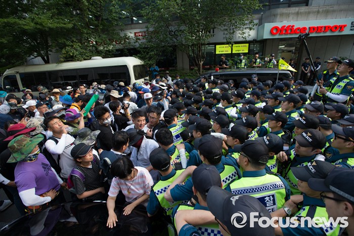 (서울=포커스뉴스) 13일 오후 유성기업 노동자 故 한광호씨의 분향소를 양재동 현대차 본사 앞으로 옮기는 꽃길 100리 행진에 참여한 노동자들이 시청 분향소에서 출발해 국회로 행진하던 중 더불어 민주당 당사 앞에서 경찰과 대치하고 있다.